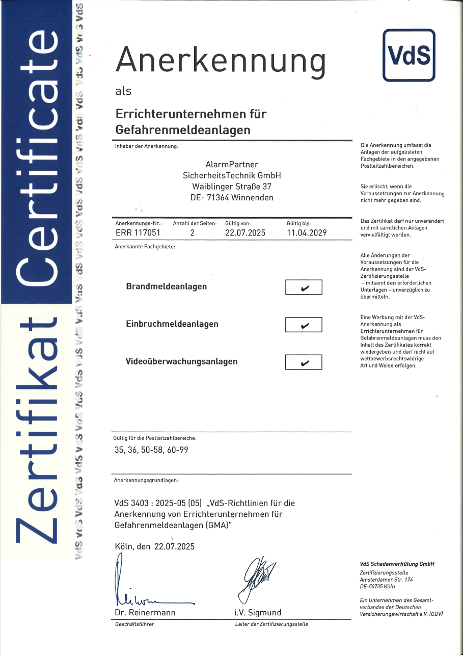 Baden-Württemberg, ist ein von Polizei, Versicherungen und VdS-anerkannter Errichterbetrieb für Einbruch- und Brandmeldeanlagen.